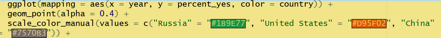 In this chunk, we are setting up our graph using the ggplot function. The first line says we want year on the x-axis and percent_yes on the y-axis. And we are going to use color to distinguish the countries.